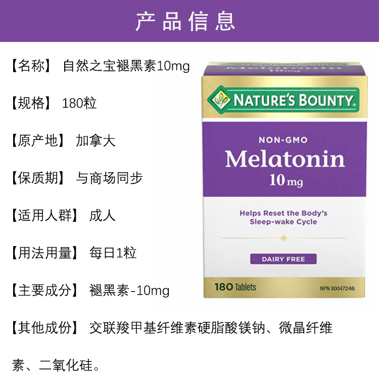 【产品名称】:Nature's Bounty Melatonin / 自然之宝褪黑素10mg*180片