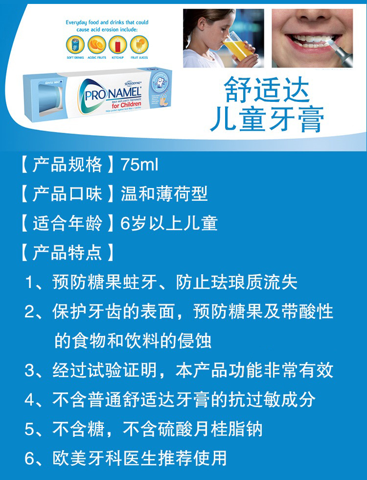 【产品名称】:Sensodyne Pronamel 舒适达儿童防蛀牙含氟抗酸蚀防止珐琅质流防珐琅质流失牙膏