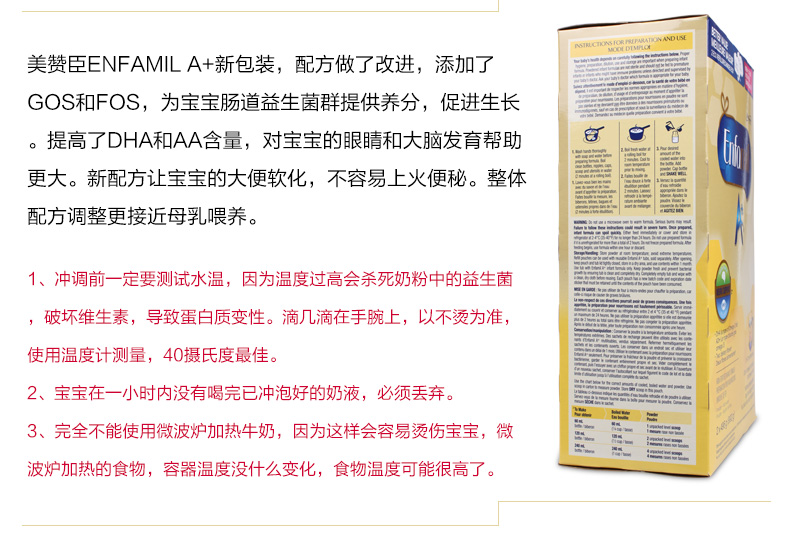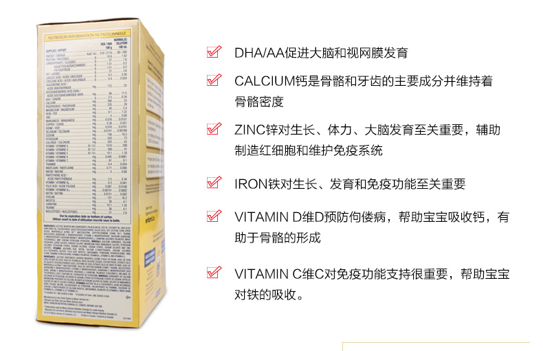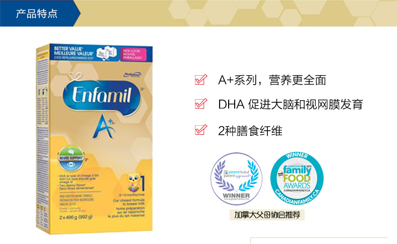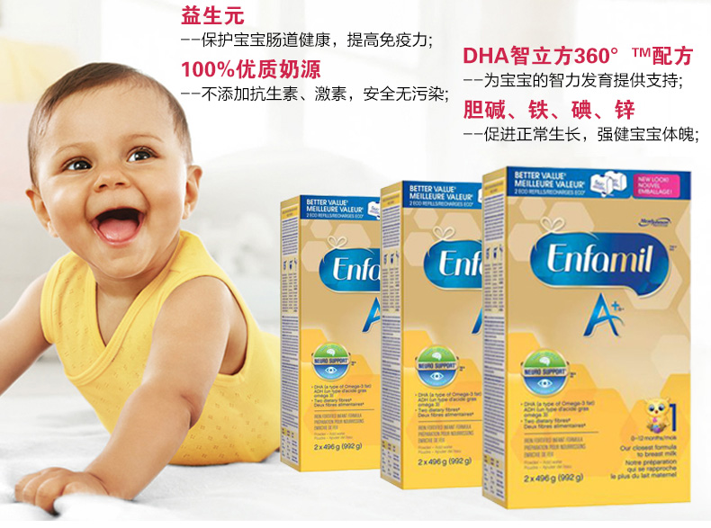 Enfapro A+比牛奶含有更多的铁、维生素C和维生素E,以及和牛奶相当的钙和维生素D,钙含量也比一阶段婴儿配方奶粉更高,能有效强健宝宝的牙齿和骨头。Enfapro A+富含DHA & ARA(Omega-3 & Omega-6),能更好地促进宝宝的脑部和眼睛发育,是培养聪明宝宝的好选择。同时Enfamil A+也是加拿大医生和护士极力推荐的品牌。